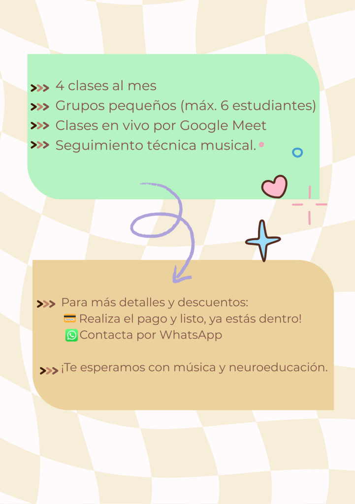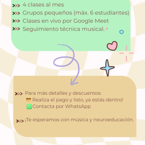 4 sesiones, clases en vivo por Google Meet, seguimiento de repertorio.