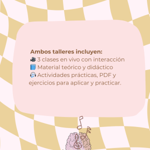 Este taller incluye: 3 clases en vivo, material teórico y didáctico. Actividades prácticas, PDF y ejercicios para aplicar y practicar.